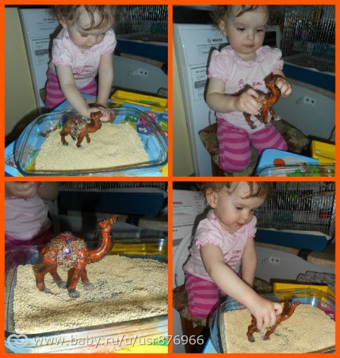 сделали простенькую сенсорную коробку: с удовольствием копалась в пшене, скакала верблюдом по «пескам».