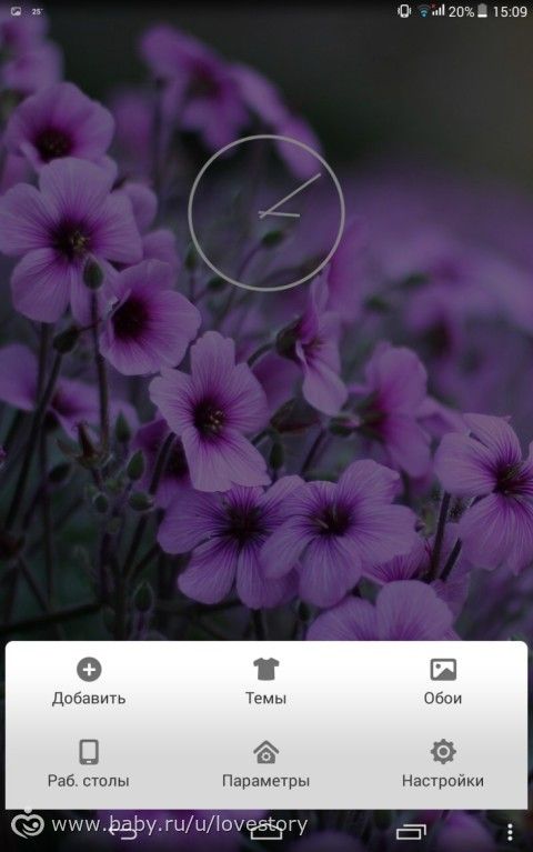 Внизу имеется контекстное меню настроек, таких как обои, темы, рабочие столы, добавление папок/виджетов и тд