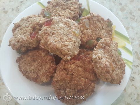 Замачиваем хлопья в кефире на 40 минут, изюм в кипятке. По истечении 40 минут смешиваем все ингредиенты. Выкладываем на противень с бумагой для выпечки. Выпекаем 30мин. при 180-200 гр. По желанию можно добавить любые сухофрукты. Вместо кефира можно использовать горячую воду. ( Я вместо изюма добавила цукаты