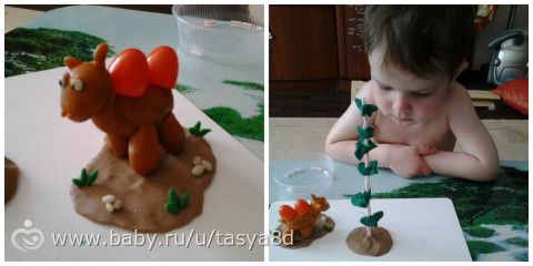 — Из мозайки сделали горбы пластилиновому верблюду, и сделали что то вроде колючки. На шпажку деревянную нанизывали порезанную соломинку и пластилин