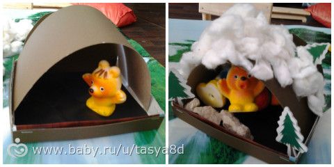 — Делали поделку — Мишка в берлоге — сверху снег, внутри семья медведей