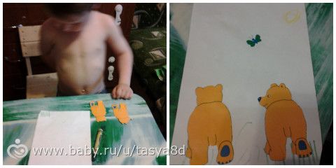 — Рисовали травку и солнышко, потом клеили наклейки медведей
