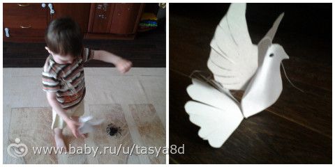 — Сделали вместе голубя — я склеила, Мишка разрезал перышки, сделал глазики из пластилина, потом попрыгал за ним, а потом с ним