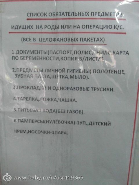 Полотенце, халат, ночнушка, сланцы, расчестка, мыльно-рыльные принадлежности, туалетная бумага, послеродовые прокладки, разовые трусы, плавки, пурелан 100, вода без газа с собой в родильный и потом, телефон, носки
