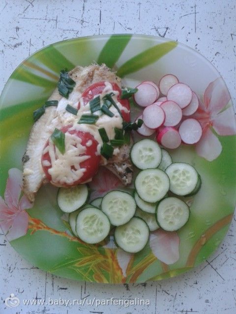 рыбу подготовить, замариновать в соевом соусе, посолить немного, поперчить.Выкладываем на раскаленную сковороду, немного масла.Обжариваем с двух сторон.Сверху помидор и сыр, накрываем крышкой… ещё забыла… добавила орегона и лавровый лист...