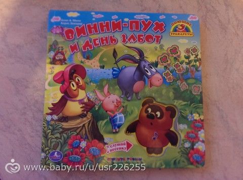1. Винни-Пух. Поющие трафареты. Переворачиваешь страницу — появляется новый герой. Когда на картинки нажимаешь, они говорят. Самая любимая книжка, до года дожила только обложка и одна страница.