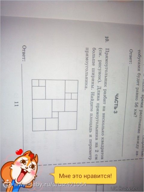 Прямоугольник разбит на несколько квадратов (см рис). Длина прямоугольника на 2 см больше ширины. Нужно найти периметр прямоугольника и площадь.
