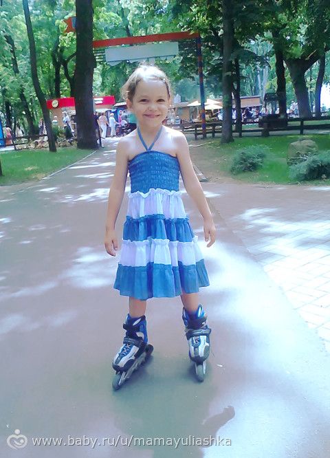 Доча по началу на них даже стоять не могла, ноги все время вперед укатывались) за руки ее конечно же держали. Еще ролики обычные, с одним рядом колесиков… трудно на таких. По началу по травке просто походила.А затем все более уверенно стала держаться на них, уже сама. Получалось проехать самой на них некоторое расстояние.Но, конечно, периодически ноги разъезжались. Но обошлось без серьезных падений.Я за нее больше боялась.Защиту там не выдают никакую...