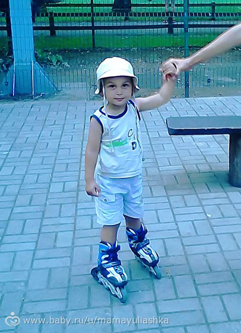 Сынок тоже все время, пока мы катались, просился на ролики. После дочи ему надели. Минут пять его покатала.У него тоже уже получалось стоять на них самому и держать равновесие)))
