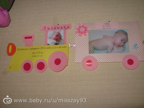 Фотки можно вставлять и вынимать.В принципе все просто.Распечатала основу на цветной бумаге, находила ее в интернете. Потом на цветной бумаге, которая с рисунком рисовала рамку и вырезала отверстия, потом основу и рамочку склеивала с трех сторон.Дальше наклеила колеса, небольшие украшения и подписала где какой месяц, наш рост и вес.И в принципе все