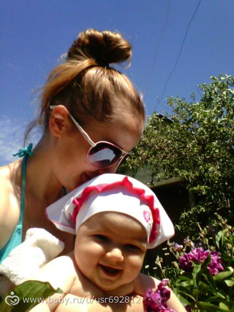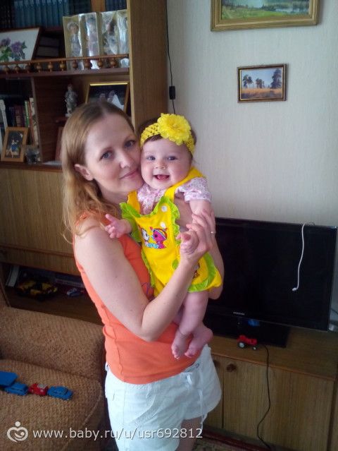 12июня нашей любимой девчуле исполнилось пол годика!!!)) Такая забавная, активная и улыбчивая девочка. Любим её безумно!!!)). Пока не сидим, вроде рано ещё, но по кровати шуршим только так… то ползком, то накатом, так и до полёта недалеко… тьфу тьфу тьфу, ещё не летали)). Старается повторять звуки… Получается татата… дадада… надя)). Обожает вертеться перед зеркалом и пускать пузыри(типо плюется, Кирюша научил)). Рост 62… вес 6500. С молочком как то не дружим в последнее время, теперь мы на св. Титя по ночам или на дневной сон, в остальном плюется и ни в какую не хочет. Не страдаю сильно от этого, она перестала рыдать (думала на зубки), а она просто недоедала. Ну да ладно. Сыты… и вес набрали за этот месяц отлично +700..