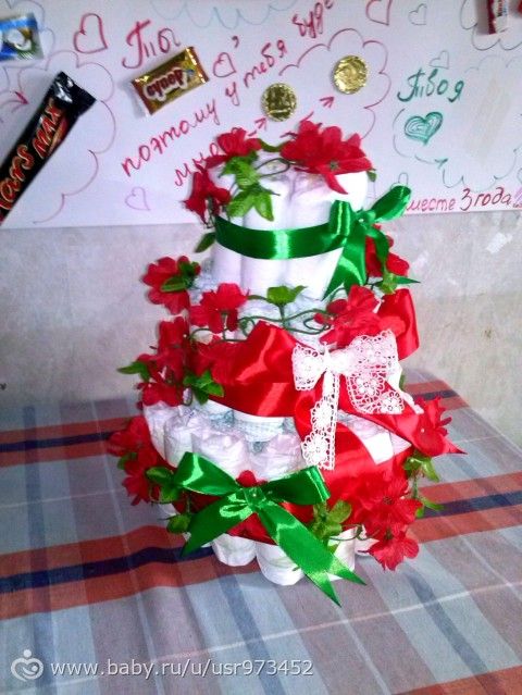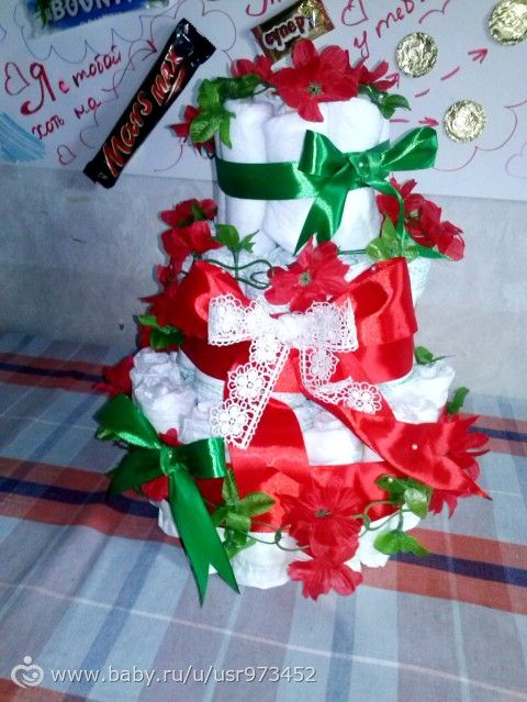 Решили подарить на рождение ребенка родственникам памперсы и денежку.вот смастерила на скорую руку тортик первый раз.думала так будет интересней чем просто пачка с подгузами.Первый слой 1, второй 2, третий 3 по размерам.Как вам? только честно.тапки тоже загребу))))