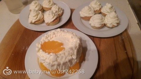 Тортик с персиками (они мини, как и тортик) крем творожно сливочный, элементарный взяли на пробу, у сына всё получилось, коржи поднялись даже в нашей пенсионерке)))))))