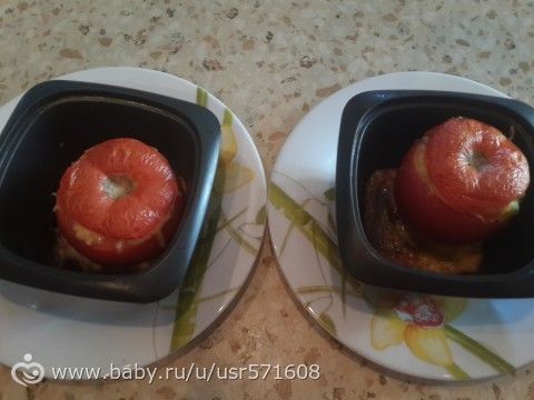 3. В помидоры влить подготовленную смесь, прикрыть «крышечками» (верхушками помидоров) и запечь
