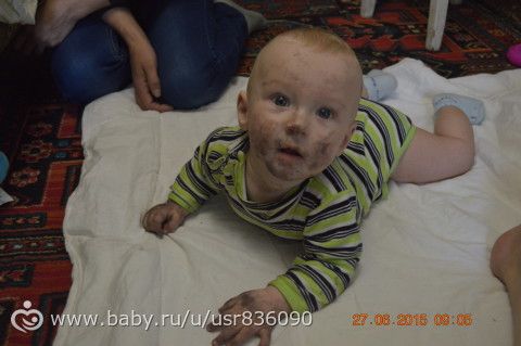 Сегодня у нас ливень на улице, приехала ко мне значит тетка, дает мне пакет(соответственно мокрый), я вытащила вещи и по дурости своей бросила на пол, а там малой мой игрался на одеялке на полу.Вышли мы буквально на минутку, заходим, а он решил поиграться с пакетом, а на нем походу краска потекла.Минут 30 ржала