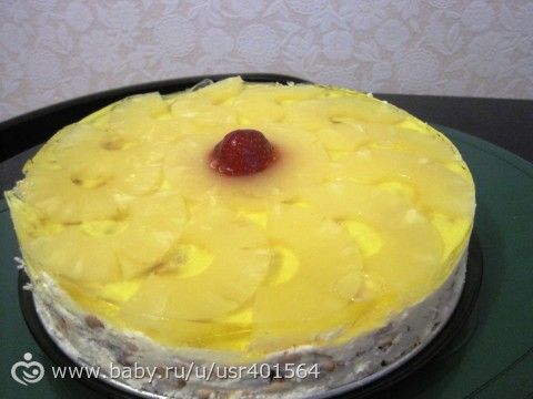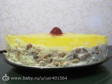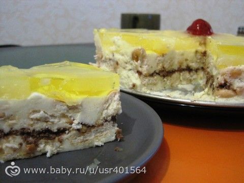 Пару дней назад делала такую вкусняшку, оригинальный рецепт взяла тут h*t*t*p:// (звездочки убрать) Гости должны были нагрянуть, но к духовке подходить даже близко не хотелось. Но немного отклонилась от рецепта: пачка крекера у меня была в 200г, и ломать его я не стала(крекер рыбки был), шоколадка была 100г (с орехами взяла), делала 2, а не 3 слоя сметанной массы, пакетик желе у меня был 45 гр-хватило, внутрь изюм я не клала и сверху тоже не виноград, а ананас.