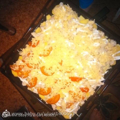 Картошку нарезать кольцами, курицу нарезать кусочками, помидоры нарезать кольцами. Затем Выкладываем картошку, затем следующий слой курица, затем помидоры. Можно майонез и наверх тёртый сыр. В духовку, разогретую до 200 градусов, на 40 минут. Всем приятного аппетита)