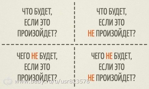 ПОЧЕМУ эта техника работает? «Квадрат Декарта» помогает прояснить последствия каждого решения. Дело в том, что в ситуации, требующей решения, мы часто зацикливаемся на одной позиции: что будет, если это произойдет? С помощью же «квадрата Декарта» мы рассматриваем одну и ту же ситуацию с 4 разных сторон.