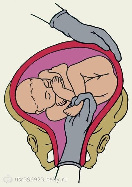 Иногда после 35 недели беременности врач может провести наружный поворот плода. Он проводится при поперечных и косых положениях плода, реже при тазовых предлежаниях. Наружный поворот проводят только у условиях стационара и под пристальным контролем за состоянием матери и ребенка и только при отсутствии противопоказаний. Но поскольку в результате использования данного метода могут быть серьезные осложнения, то эта процедура используется крайне редко.