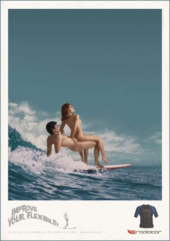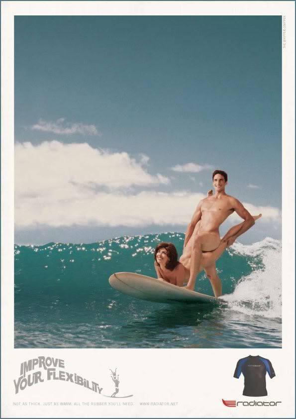 Скандальная реклама одежды для серфинга Radiator: «Улучши свою гибкость» («Improve your flexibility»).