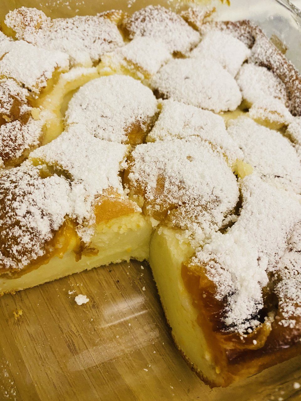 Сборка: форму смазываем маслом, выкладываем тесто и распределяем по форме, выкладываем половинки абрикосов и заливает сливочно-творожной массой.