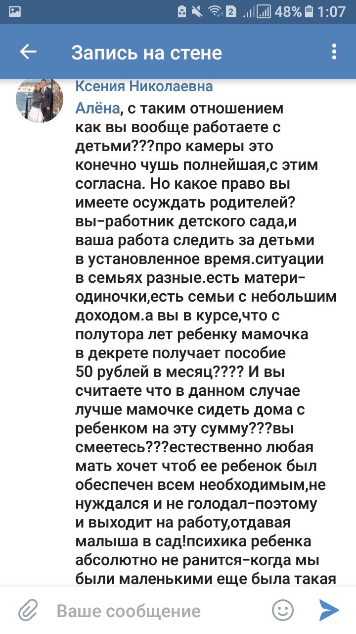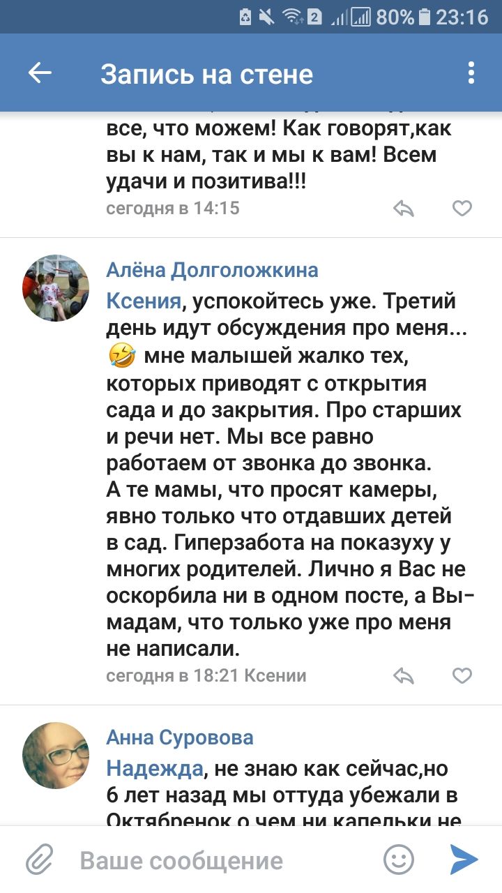 Конечно, кому-то везёт, многие отзываются положительно о посещении сада… Хотя как можно быть на 100% уверенным, ЧТО именно происходит в садике, когда тебя там нет? Ведь дети всё, что там происходит, зачастую принимают за норму, т.к. доверяют родителям и вообще взрослым доверяют, даже если они их обижают… Воспитатели при родителях могут мило улыбаться и ласково ворковать с детишками, а стОит родителям пораньше вернуться за ребёнком, как совершенно неожиданно можно обнаружить совершенно другую картину. Если повезёт. А можно и никогда и не узнать об этом. Вот если бы в садах видео-камеры стояли и потом записи давали бы просматривать родителям)))))))) Другое дело))