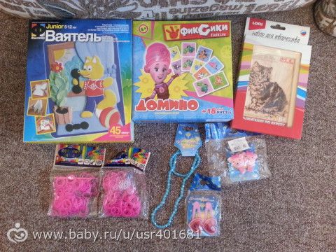 Для Полинки стооолько всего! Сокровища!Гипсовый набор, домино, картинка для выжигания, резиночки для плетения, бусики и браслет, заколочки. Альбом, аппликация, цветная бумага, мелки, карандаши, краски, кисти. Для Поли это такие богатства, просто вообще!!!
