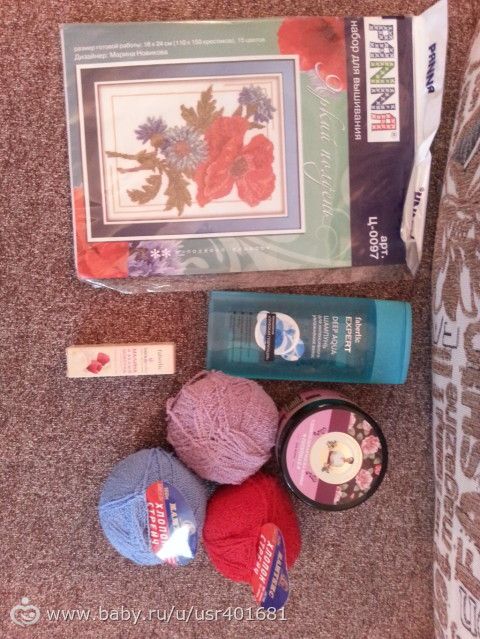 Для меня вышивка!!! классная!!! Ниточки, швмпунь и маска доя волос, бальзам для волос. Все очень классное!!