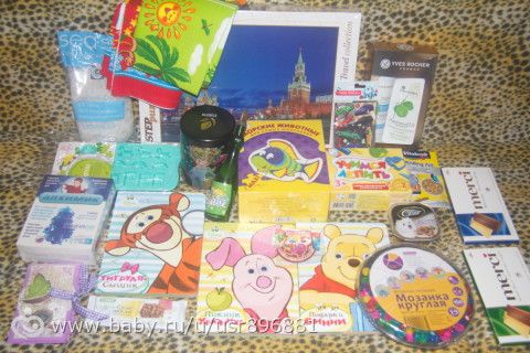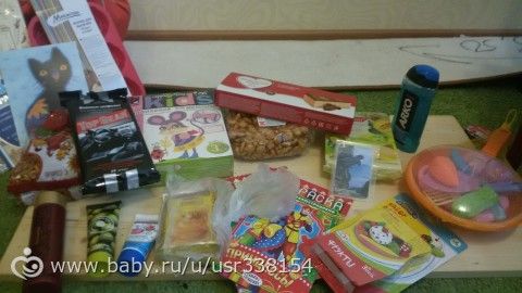 в этот раз нам прислали игрушечный набор для Лизы, раскраски.аппликации (вчера сделали с ней).тесто. Для папы гель для душа и открытку.Мне лосьон для тела и крем.Веселое полотенце с обезьянойи формочки для выпекания.Доску разделочно-мерную и книгу с рецептами.Даже пузожителю досталось-очаровптельный бодик и нижнее белье) Котику тоже привет прислали в виде вкусняшек. Ну и нам вкусняхи разные.