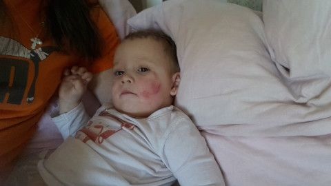Сначала София переворачивается на льдянке, лицом в снег… Попала на льдинки, поцарапала всю щеку, нос и верхнюю губу до крови.