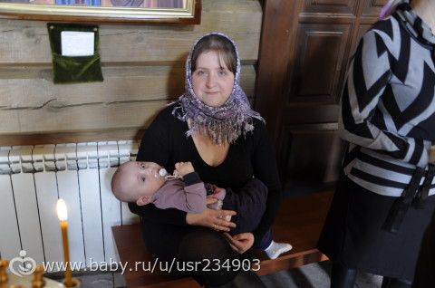А на душе как-то неприятно и неспокойно. Не так я представляла сегодняшний день. Крестили мы Леву в храме Святой Троицы на ул. Фучика (Автозаводский р-он). Крестные, как полагается, прошли все беседы. Мы подготовили крестильную рубашку, полотенце. Ждали очень этого радостного для нас события. Но все получилось не так. В церковь нам велели прийти в 10.30. Когда мы пришли, там была еще служба. Народу было очень много, просто не пройти. Кое-как мы пробрались к церковной лавке, купили свечи, оформили свидетельство о крещении и стали ждать. Служба закончилась, началась исповедь и причастие. Народ очень медленно, но стал расходиться. После службы начался молебен. Длилось это наверное дольше часа. я уже не следила за временем, но ребенок уже устал. Хорошо, что муж хоть с Ульяной ушли в машину и там он ее развлекал. после молебня началось крещение. Причем началось как-то прям неожиданно и по-тихому. потому что батюшка ВСЕ молитвы читал про себя. С нами крестили еще маленькую девочку, месяца 3-4, и мальчика полутора лет. Если малыши вели себя тихо. то этот мальчик видимо испугавшись всего происходящего начал орать просто нечеловеческим голосом. Кричал он все крещение, чем очень раздражал батюшку. К слову, о батюшке. Как я уже сказала он ни одной молитвы не прочитал вслух. Просто объявлял, что читает молитву такую-то и дальше просто смотрел в книгу. Я даже не знаю, читал ли он их вообще. Все делалось очень быстро, было видно, что батюшка всем недоволен, особенно его раздражал мальчик, который кричал. У него уже истерика началась по-моему. Жалко его было. Потом детей окунули, причем опять все не по правилам. Сначала должны окунать мальчиков, потом девочку. А он окунул нашего Леву, потом девочку и потом плачущего мальчика. Когда позвали матерей, батюшка начал высказывать маме этого мальчика, что она наверное в церковь не ходила и ее грехи перешли на ребенка и поэтому он орет. Разве можно так говорить? Потом он случайно вспомнил, что мальчиков надо внести в царские врата. И крещение наше закончилось так же неожиданно, как и началось. Да, еще забыла, молитву Символ Веры, которую с крестных требуют чуть ли не наизусть он не спросил и пробубнил себе под нос, чтобы побыстрее все закончилось. Я одного не могу понять, если церковь требует выполнения всех правил, прохождения бесед, то почему они не выполняют все требования к крещению сами? Настроение было испорчено, крещение для нас оказалось не праздником, а не пойми чем. Ну и виновник торжества, Лев, в ожидании крещения на руках у крестной.