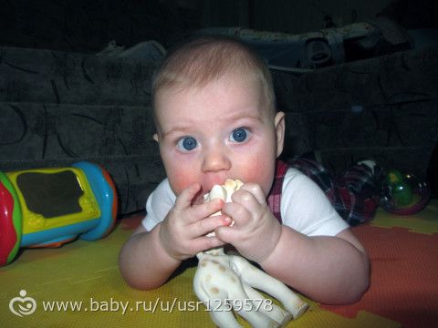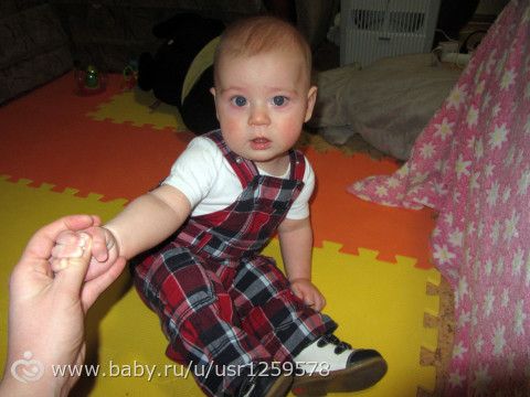Стоит и качается на четвереньках, ползает как лягушка, отталкивается двумя ногами. Вчера впервые пробовал переставлять ноги по очереди, думаю, еще пара дней и он полноценно поползет :)