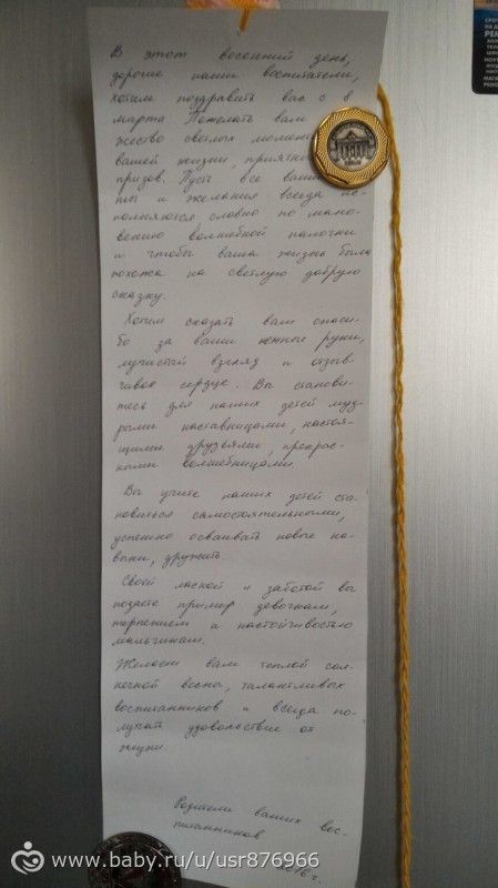 в общем, отчитываюсь. Спасибо огромное за ваши бесценные советы! Написала речь я на бумаге, свернула в трубочку. Буду зачитывать с листа. (на фото — магниты, к холодильнику прикрепляла разворот) Писать пришлось самой (но кое-что запомнила из ваших слов), инет как всегда не вовремя вырубился, т.е. в тот момент, когда я решила писать