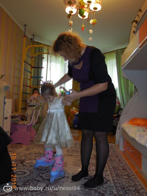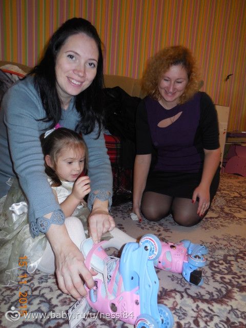 Полина получила подарок от нас с папой — ролики. И еще много подарков от гостей.