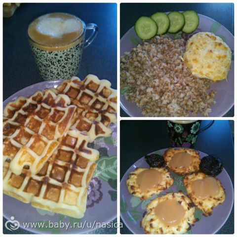 Ужин: творожные сырники с яблоком, ябл. пюре б/с, чернослив, кофе. Один сырник не доела...