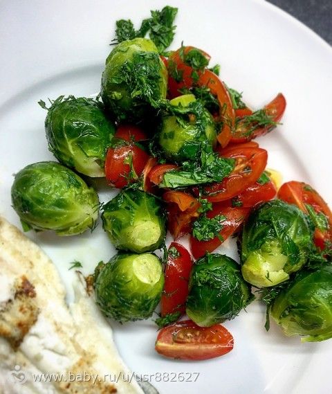 Все проще простого. Отварите (или сделайте на пару) брюссельскую капусту. Не варите долго, она не должна быть слишком мягкой. Ну до состояния «аль-денте». Помидоры нарезаем. Мелко режем укроп, петрушку и базилик. Заправляем оливковым маслом, солью, перцем и для любителей чеснока, чесноком :)