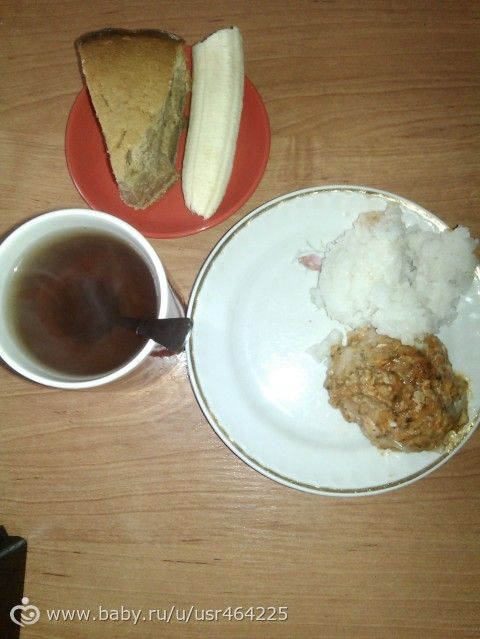 Чай, рисовая каша, ленивый голубец, манник, банан… завтрак был в 9 утра, и в 11 я слопала еще банан..