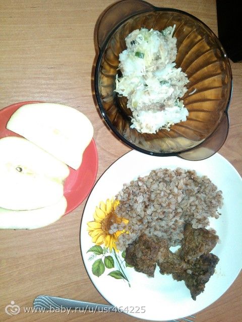 Гречка отварная, печень, тушёная в системном соусе, системный салат, яблоко.