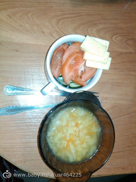 Системный суп(сваренный на воде, рис пропаренный+капуста+морковь+лук+чеснок), салат(половина огурца+половина помидора).