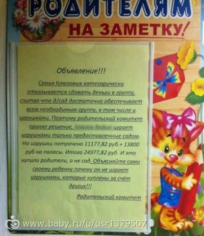 Имя ребенка, чьи родители не сдали деньги на игрушки, опубликовали на доске позора в детсаду. Родительский комитет «официально» запретил 3-летнему мальчику играть в игрушки, купленные на пожертвования чужих родителей. Это финиш, товарищи!!!