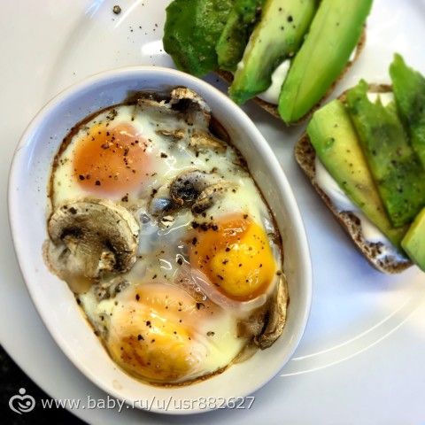 Прогреваем духовку на максимум. Форму слегка сказываем растительным маслом. Выкладываем начинки. У меня грибы. Сверху Яица выкладываем и в духовку на 8-10 минут. Подаем сразу.