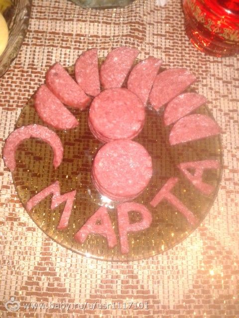 в этот день я работала. пришла в 17.00 с работы дома накрыт стол приехали в гости друзья которых мы не видели год точно( из за работы и их графика не могли увидиться раньше). ну так вот. меня сразу посадили мужчины на диван преподнесли бокал шампанского и сказали отдыхать. муж мне подарил кошелек который я очень хотела подруга коробку конфет дав. и муж на стол поставил колбаску нарезку вот такую: