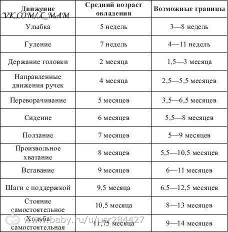 Вот клевая табличка есть, я по неё ориентировалась. Правда моя шило, все рано делала, по нижней границы нормы, вот только ходить стала в 1 год и 10 дней, зато сразу нормально пошла и не падала. Видимо ползать ей привычней было, с 5 месяцев на четвереньках ползала, очень быстро )))