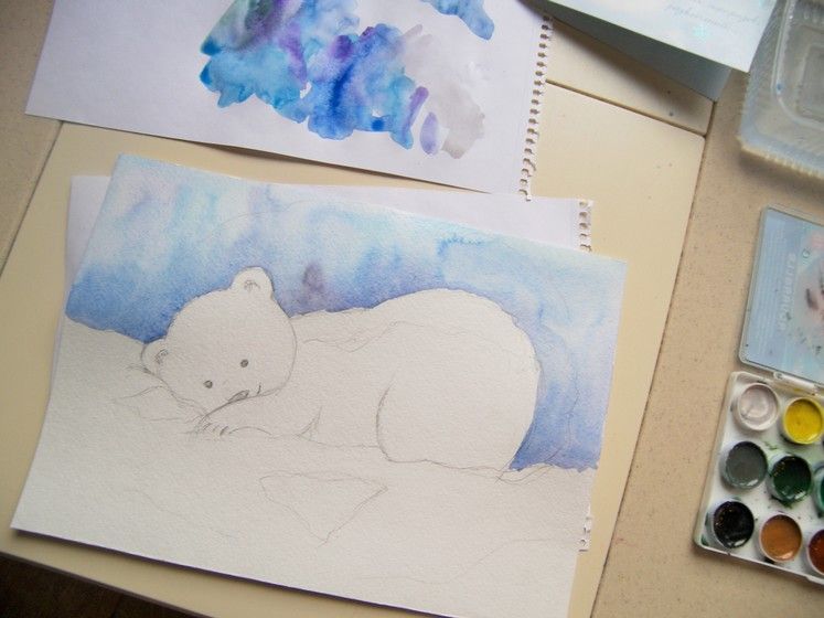 Нижнюю часть бумаги (снег) смочила кисточкой с чистой водой. На сырую бумагу нанесла немного голубой краски.