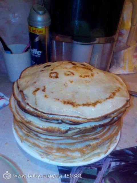 скажу сразу, эти блины были в детский сад на Проводы зимы. На группу из 25 человек. Я не считала наверняка, но теста получилось ровно на 60 штук! Два с половиной часа старани. Дочка почему то сразу прикинула, что блинов может всем ребятам не хватить и поначалу отказывалась есть. Потом я ее все же уговорила и десяток она съела за весь вечер со сметаной.