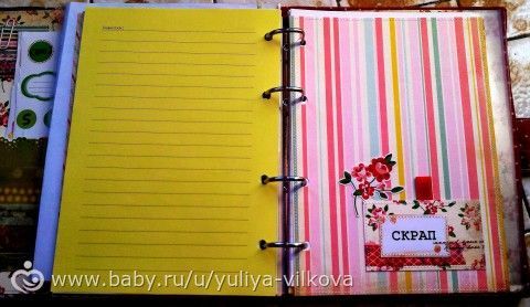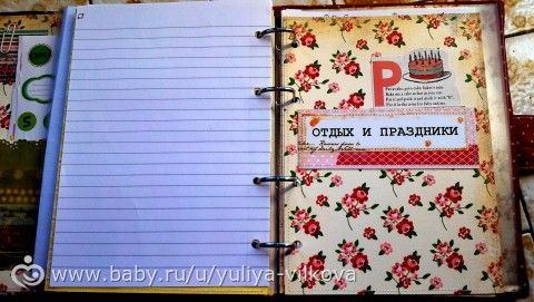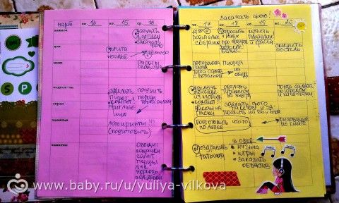 Вот и я так же. Стала списки делать занятий, программки, наброски, но они куда-то терялись. В итоге, перелопатив кучу сайтов и книг, составилась у нас обширная программа, по которой хоть что-то надо каждый день делать. Тут и возникла идея сделать себе ежедневник. Опять же, почитав, посмотрев, прикинула себе черновик, нарисовала на компе себе разные таблички, прикинула разделы. Обшив тканюшкой папку формата А5 с раздвишными кольцами, наскрапила разделители и собрала все в один еждневник. Тут и планы на неделю, меню, покупки, долгосрочные списки, занятия с детьми, планы на поездки и праздники, заметки по скрапу. Конечно, таскать с собой книжку А5 не очень удобно, но почерк у меня очень крупный, на А6 мне на каждый день надо по страничке. Украшаю все это скотчиками и детскими наклейками. Опять же выполненные дела вычеркиваю, сразу видно, что что-то делается. А то обычно ощущение, что постоянно на месте стою.