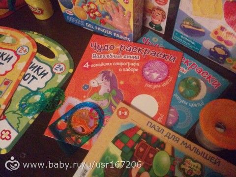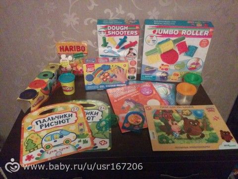 Два набора для пластилина, в одном разные фигурные шприцы, нож, ножницы, пластилин. Во втором валик с вырезными фигурками транспорта, пластилин. Дополнительный набор пластилина. Раскраски пальчиками две штуки, пальчиковые краски, пазл и две необычные раскраски с трафаретами, как в нашем детстве загогулины рисовать :) а и два стаканчика непроливагки и мармелад :)