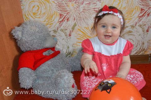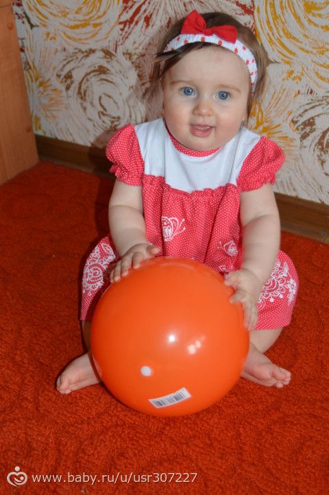 Ульяна весит 9кг, рост 68 см. Сидит, встает, активно ходит у опоры, ползает на четвереньках, кушает — все овощи, все фрукты, каши, мясо, творог, домашнийсуп уже варю, лапшу, компот, хлеб. Короче все что не дашь- ест))) Спит опять всю ночь, ложится ровно в 22, встает в 8) Стала очень интересная, забавная)