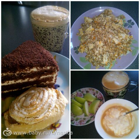 Завтрак: небольшой кусочек торта и печенька творожная (все покупное) кофе.