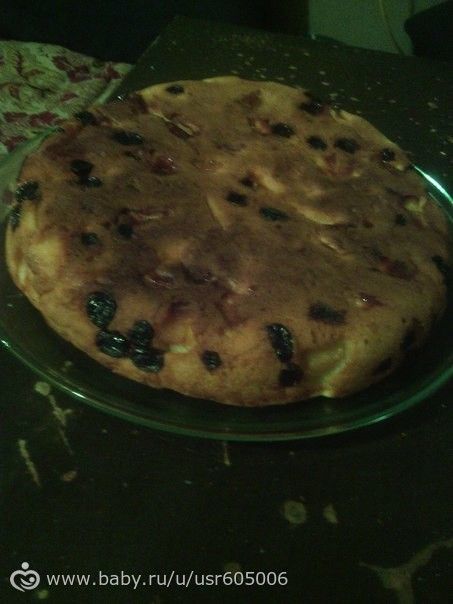 Мультиварку разогрела, смазала сливочным маслом, кинула на дно немного изюма и вылила тесто. Выпекалось 50 минут.Далее перевернула и можно кушать.